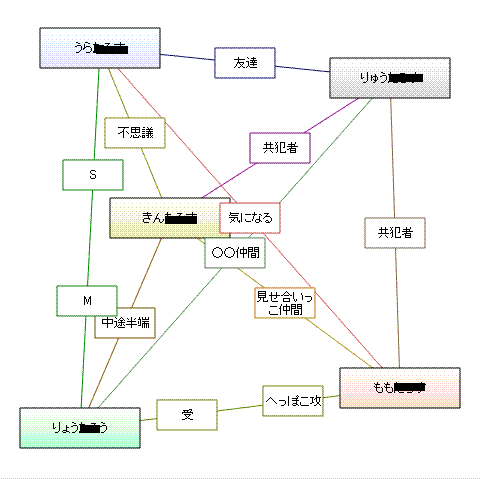 着々と移転の準備が進んでませんよ^^ うーん…どこにしようかなぁ…。 よく考えたらべつにshinobiのままでも良いじゃんね。 ID変えりゃいいんだから。 とりあえずJugemとFC2で考え中。 アメブロでも良いけど携帯で見ると重いかんなぁ~。 まぁ近いうちにでも。 もちろんオフ友、オン友にはメールか何かで新しいHNとともにお知らせいたします。 そーれーでーさー!!! 相関図ジェネレータなるものがあるんですよ。 2~5人の名前を入れたら相関図にしてくれるの。 それでいろいろ名前入れてやってたんですよ。 千沙美にしようが、本名にしようが、ナッツとウチが「同士」とか「腐女子仲間」になるミラクルwwwwwwwwww それでね、面白半分ででんおーの人たちを入れてみたんですよ。 そしたらこうなりました。 なんじゃこれwwwwwww テキストにすると りゅう-[友達]-うら きん-[不思議]-うら もも-[気になる]-うら きん-[中途半端]-りょう うら-[S]-[M]-りょう りゅう-[共犯者]-きん りゅう-[○○仲間]-りょう りゅう-[共犯者]-もも もも-[見せ合いっこ仲間]-きん もも-[へっぽこ攻]-[受]-りょう こうです。 うらとりょうとももの関係がgthmすぎるwwwwww 面白すぎるわw やりたいかたはこちら 相関図ジェネレータ(PCじゃないとできないと思われ) さぁ、なにしようかなー